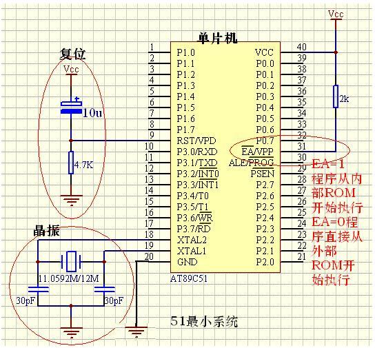 特别注意:对于31脚(EA/Vpp),当接高电平时,单片机在复位后从内部ROM的0000H开始执行;当接低电平时,复位后直接从外部ROM的0000H开始执行.这一点是初学者容易忽略的.
