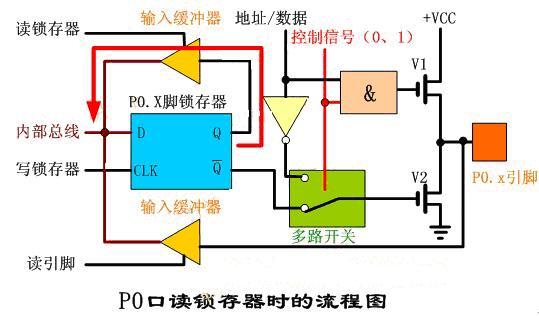 读芯片引脚上的数据,读引脚数时,读引脚缓冲器打开(即三态缓冲器的控制端要有效),通过内部数据总线输入,请看下图(红色简头)。