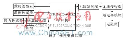 本系统由5部分组成:传感器信息的采集与分析处理、信息发送与接收、本地设置与显示模块、控制终端、执行机构。传感器信息采集与处理模块负责测量压力、温度等信息;信息的发送和接收通过无线模块实现;本地设置与显示由按键和数码管组成,可以实时显示温度、水量等信息,并能通过按键由用户自行设定参数;控制终端负责收集信号并使执行机构做出相应动作;执行机构由继电器和电磁阀组成,可以灵敏、精准的动作。