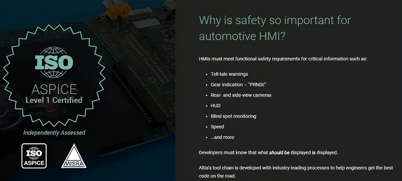 Altia有将近30年的发展史,并且通过了AutomotiveSPICE汽车级HMI的一级认证,这个认证共分为6个级别,0到5级,其中第5级是最高等级。