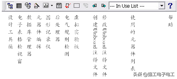 图1-3是主工具栏及按钮名称,图1-4是元器件工具栏及按钮名称,图1-5是虚拟仪器工具栏及仪器名称。