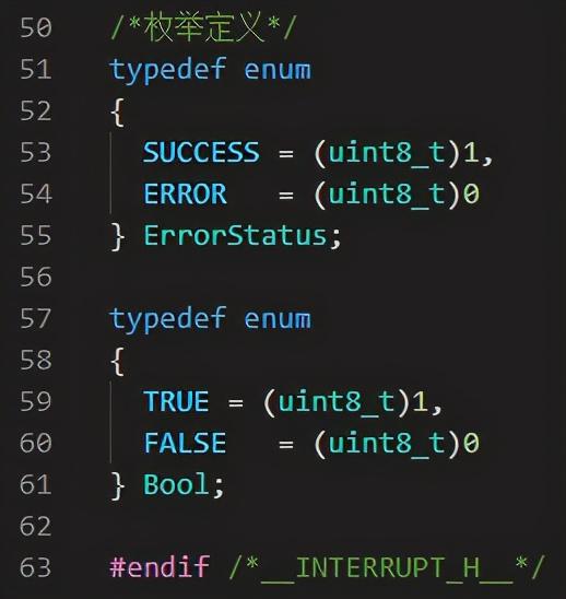 5.枚举变量类型定义,当函数返回1表示正确,返回0表示错误,用0和1代表并不直观,此时用枚举变量是最合适不过了。同样的道理,适合TRUE/FALSE