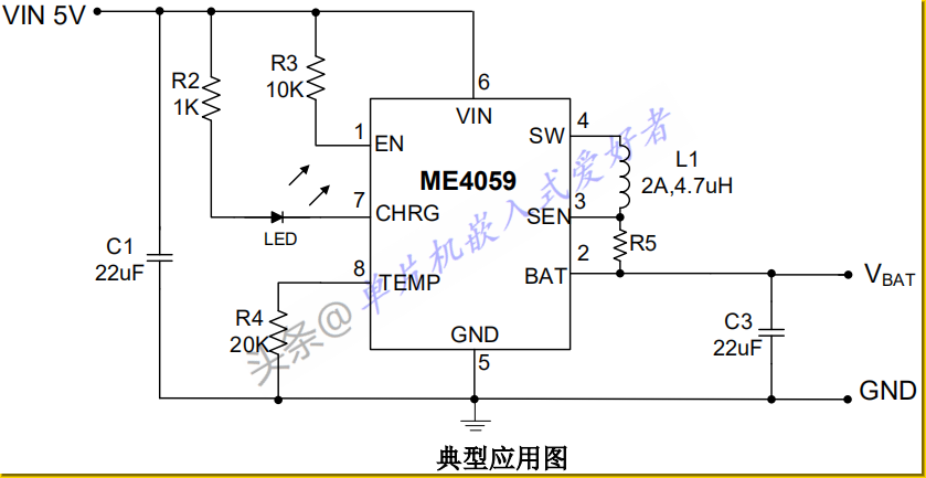 上面介绍的TP4057是500mA单节线性锂电池充电IC,当然你也可以根据你实际需求选择其他类型的充电芯片,下面再介绍一款开关型充电芯片ME4059。