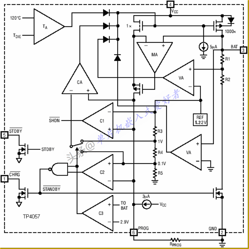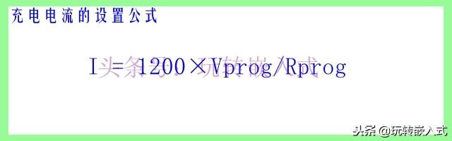 该芯片最大可输出1A的充电电流,只需要通过一个外接电阻即可实现充电电流的调节功能。第2引脚在预充电阶段,其电压被调制在0.1V,而在充电阶段其电压被限定在1V,充电电流的设置公式如下图所示。