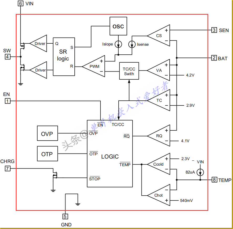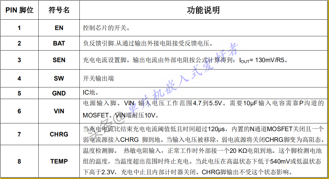 芯片第1引脚是电池温度检测输入端,将一个热敏电阻NTC和一个固定阻值的分压电阻接入该引脚即可实现电池温度的检测功能,在芯片内部将电池电量的45%和80%作为低温和高温的报警门限,温度超限后充电被自动停止。将该引脚接入GND,则电池温度检测功能被取消。