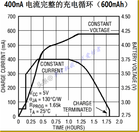 下面就介绍一款常用锂电池充电芯片TP4057,实际应用中可以根据自己需求选择其他型号的充电IC,原理都是大同小异。我们先看一下TP4057对锂电池的充电曲线图吧。
