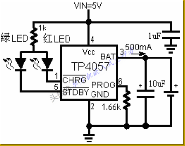 充电电流输出端第5引脚接被充锂电池的正极。第1引脚接地,即不需要对电池进行温度检测。第2引脚接入的电阻为1.2K,最大充电电流为1A,充电时显示红色,充电完成显示绿色,电阻R2,R3是LED灯的限流电阻,防止流过LED的电流过大,将其击穿。