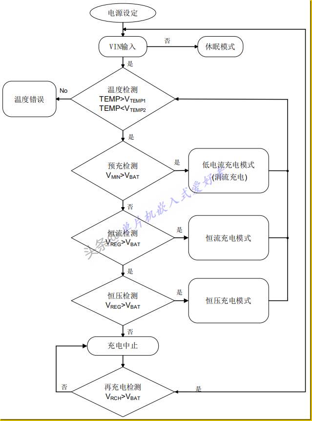 ME4059锂电池充电芯片工作流程如下,大部分锂电池充电芯片工作流程都和下图差不多。