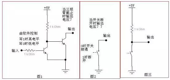 推挽结构一般是指两个三极管分别受两互补信号的控制,总是在一个三极管导通的时候另一个截止。我们先来说说集电极开路输出的结构。集电极开路输出的结构如图1所示,右边的那个三极管集电极什么都不接,所以叫做集电极开路(左边的三极管为反相之用,使输入为“0”时,输出也为“0”)。对于图1,当左端的输入为“0”时,前面的三极管截止(即集电极C跟发射极E之间相当于断开),所以5V电源通过1K电阻加到右边的三极管上,右边的三极管导通(即相当于一个开关闭合);当左端的输入为“1”时,前面的三极管导通,而后面的三极管截止(相当于开关断开)。