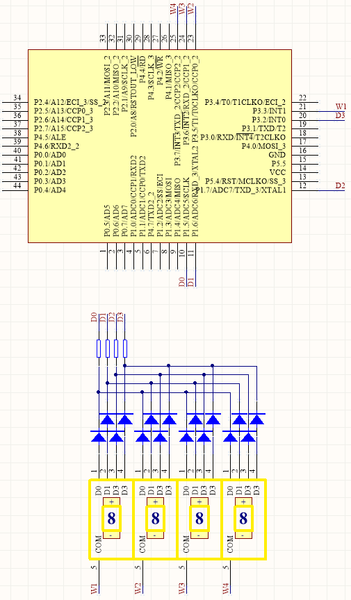 单片机上电复位时,W1-W4保持高电平。我们用它们来读取各数据位的状态,在工作期间不去变更它们的电平状态,它们的电平状态将由D0-D3来决定。