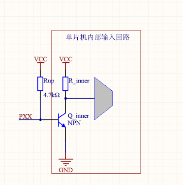 因为单片机内部不外乎是各类逻辑门电路的集成,而逻辑门电路由晶体管组成,单片机IC引脚在单片机内部有输入回路与输出回路,输入回路可等效为“图三”及“图四”,其中Rup与Rdown均为外接上拉与下拉电阻,PXX为单片机某IO引脚。而输出回路工作模式有推挽式输出与集电极(漏极)浮空输出模式,以后者为例,输出回路可等效为“图五”,其中Rup为外接上拉电阻,PXX为单片机某IO引脚。