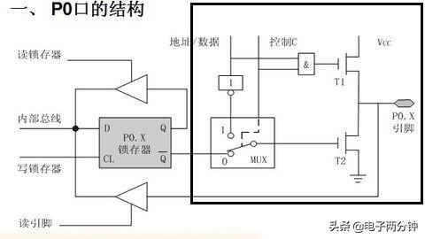 学过51单片机的朋友可能知道51单片机的P0口需要加一个上拉电阻,这个上拉电阻的作用其实就和上面那个电路有相似的地方。我们来看一下这个P0口输出端,只看用黑色框框起来的部分,在T1管子的左侧有个与门电路,与门电路有两个输入端,实际上输入端总有低电平,所以这个与门电路总是输出低电平,因此T1管处于截止状态。