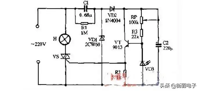 如下图所示,当电网电压小于220V时,双向可控硅SCR2控制极上的电压也随电网电压减小而降低,致使VD2导通较小,C1端电压上升,从而使双向可控硅SCRl控制极电压升高,使输出电压上升。反之,输出电压下降,达到稳压。