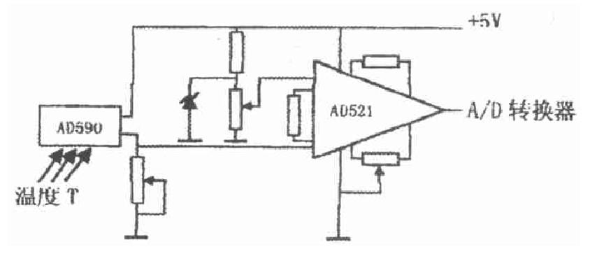 为了讨论问题方便, 我们以温度传感电路为例进行分析。通常, 在自然情况下, 窗户的开关与生活环境和人体的舒适度有关, 温度的测试是该系统设计的关键。为了较好地测出温度参数, 我们选用集成温度传感器AD590(可测-55~+150 ℃) , 其温度检测完全可以满足要求。基本电路如图二所示。
