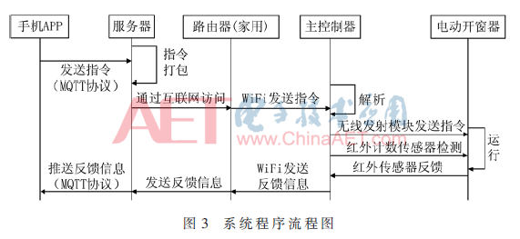 从手机终端发出控制指令到窗户执行指令,是依靠系统程序来完成的。系统程序是整个系统的核心,其程序流程图如图3所示。手机APP采用消息队列遥测传输(Message Queuing Telemetry Transport,MQTT)传输协议发送指令消息到服务器上,服务器打包消息通过互联网访问到家里路由器,路由器经WiFi方式把消息传递给主控制器,主控制器解析指令消息后经无线发射模块发送到电动开窗器的接收模块,控制电动开窗器的运行进而控制窗户的开关。同时红外计数传感器不断对电动开窗器链条节数计数采集并依次发送到服务器上,服务器收到数据再一一推送给手机终端作为反馈信息。该系统程序主要包括两部分:手机APP软件程序设计和控制器的程序设计。