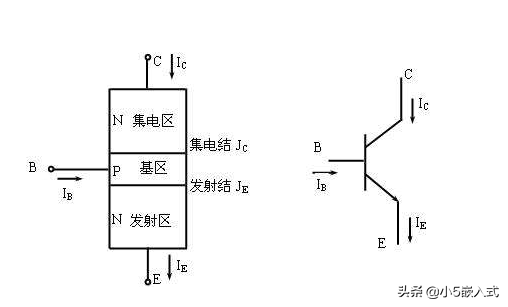 对于这里的开关S,我们需要用一个电子器件将其换掉:三极管是一个很不多的选择。说道这里,我们再来看一下三极管的简单控制原理: