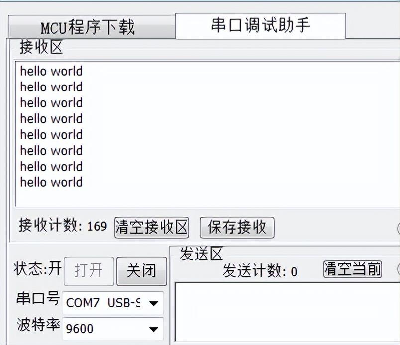 首先我们上节所说的发送起始已经涉及到接收了,只是我们上节在发送的时候对端是作为接收来呈现了我们的发送的效果。如下图所示,单片机在代码的控制下循环的发送数据“hello world“,那pc作为接收方,接收了这个数据,并解析出来,只是相较于单纯的串口接收来说,它多做了几步,就是将串口收到的数据,通过usb-串口转换线转换成usb的数据,又通过usb接口将数据送给了运行于PC上的驱动程序,再通过windows系统的系统调用应用程序获取并显示出对应的字符串。