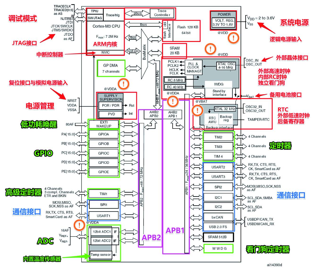 通过以上内容,我们大致了解了STM32内部每个功能的特性和用途,初学者有些概念不理解也不要紧,脑子里有个大概印象即可,等系统学习各功能编程的时候再回过头来看看,也许就会多一分领悟。最后,我们把STM32数据手册中的内部功能关系框图摘出来标注一下,仔细研究这张框图,彻底了解所有内部功能之间的关系,可以帮助我们清晰地认识这款单片机,再学习某些知识时会有更深刻的理解和记忆。