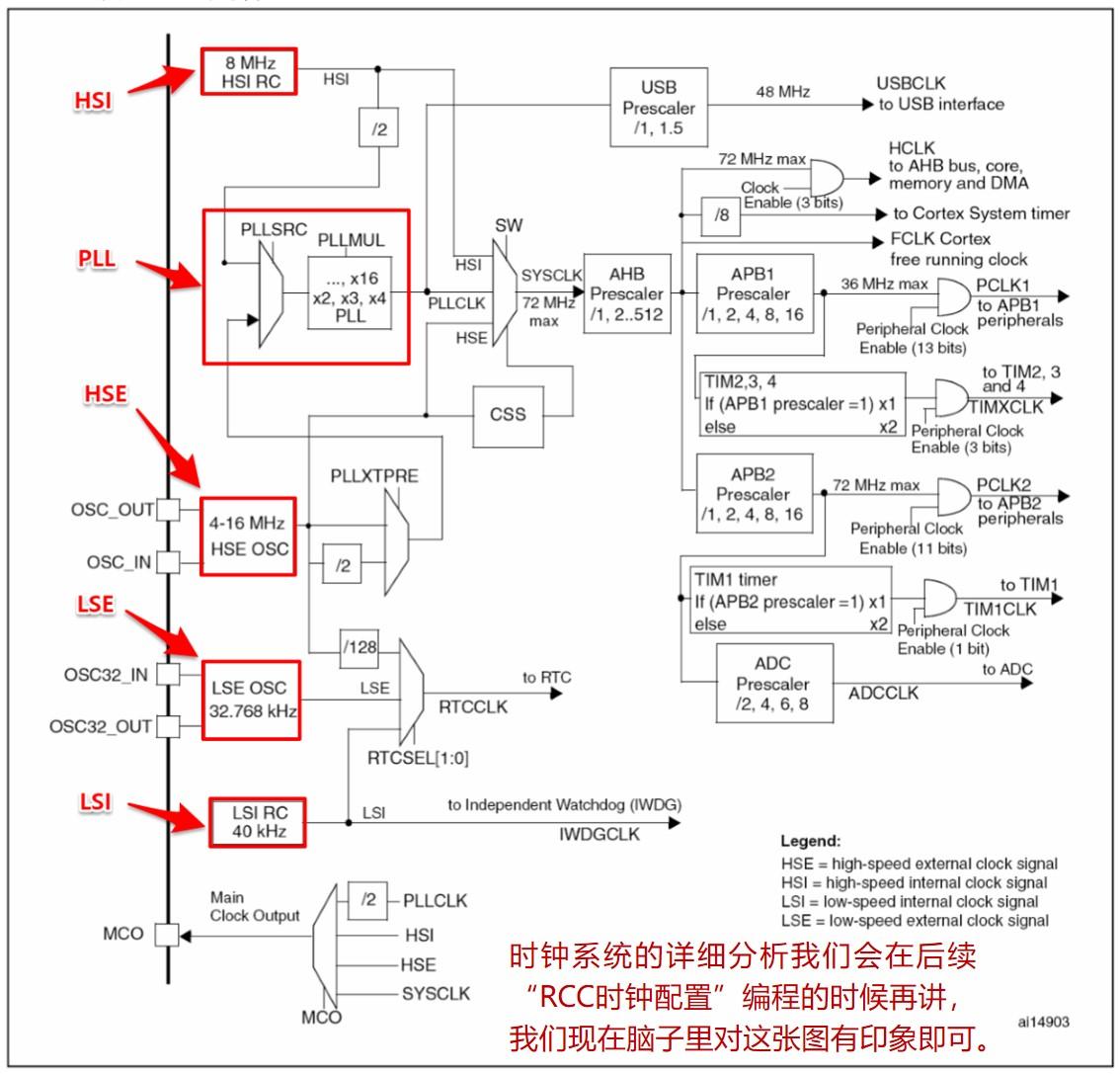 时钟的重要性 时钟是指处理器工作的基准频率的来源由一个电路(芯片内部或外部都可)产生类似脉搏的脉冲信号,一下一下有规律地稳定地跳动,单片机中所有功能组件都需要将这个跳动作为其工作的标准。处理器的运行速度取决于时钟频率① 图中的方波由高到低再到高(图中tHSE的部分),就是一个时钟周期。② 在一个时钟周期内,处理器能运行一条“单周期”指令;还有一些“多周期”的指令需要多个时钟周期才能执行完毕。③ 时钟频率越高,处理器执行指令越快,所表示出的运行速度就越快。STM32的时钟周期