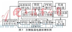 在固定的开门时间T之内,用计数器累计待测振荡脉冲数量N,关门时刻用锁存器保存这个数值,同时清零计数器再次启动计数,可以测出振荡频率f=N/T。因为调频广播接收本振的频率大约在100 MHz附近,所以设计频率测量的开门时间为320 μs,用16位二进制计数器,测量的精度可优于10-5。测得的频率数值利用SPI接口送给单片机,再结合检波电路测量得到的信号强度瞬时值就能绘制出频谱曲线。图3是扫频振荡电路的原理框图。