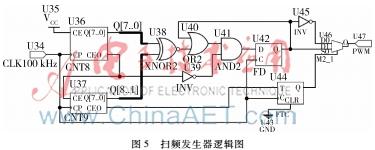 在17位计数器中,设计8位同步计数器U36作为低8位,9位同步计数器U37作为高9位,并把U37的最高8位与U36的数值送给全等数据比较器U38,两计数值相等时输出高电平脉冲信号,置位触发器U42,然后一直保持1状态直到低位计数器溢出。在U47输出扫频用的PWM信号,再经过外部的RC低通滤波器产生锯齿波扫描电压。