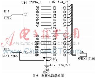 外部压控本振信号从XCLK输入16位同步二进制计数器U14,CPLD内部对100 kHz时钟64分频得到的1.562 5 kHz信号从U12送到锁存器U16、U17的时钟端和计数器的异步复位端RESET,在上升沿锁定数据并复位计数器。计数值从U18送到SPI输出电路。