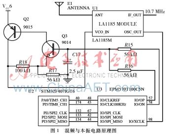 CPLD的57、58管脚输出电压控制信号,经过R15、R16和C17组成的RC低通滤波器,再用Q2、Q3这两个三极管放大,加在LA1185接收电路的压控振荡器[1]VCO_IN上。当控制电压较高时,变容二极管结电容较小,振荡频率较高;而电压较低时,变容二极管结电容比较大,振荡频率较低。