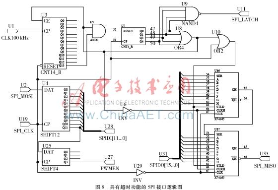 在SPI总线空闲时,SPI_CLK为1。超时计数器U3在100 kHz的时钟驱动下,若SPI时钟计数器非零,则累加计数。如果计数期间发生了SPI总线活动,SPI_CLK的低电平可以清零计数器U3,使之不能溢出。如果计数期间SPI总线一直空闲,那么在1.638 4 s后计数器U3溢出,清零SPI时钟计数器U7,从而复位整个SPI接口。