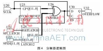 同步二进制累加计数器U23由12位触发器组成,在压控本振脉冲XCLK的上升沿到达时刻同时翻转,累加计数脉冲数量。12位的上限数据锁存器U24由12个D触发器组成,在SPI_LATCH的上升沿,把从SPI接口收到的D[11..0]的数据值保存起来作为计数上限。全等数值比较器U26把上限锁存器U24和计数器U23的12个数据位逐位进行异或运算之后,再进行12位的或非运算,只有当锁存器与计数器两者数值相同时,比较结果才输出1,下一个时钟边沿将清零计数器。为了防止因各门电路速度差异,导致电路发生部分清零,计数器U23设计了同步清零端SYNC_RESET,所有触发器只在XCLK上升沿同时翻转,保证可靠清零。因为鉴频鉴相器对脉冲边沿特别敏感, 所以用触发器U30锁存数值比较结果,每次溢出,都能产生一个OVERFLOW信号送入鉴频鉴相器。