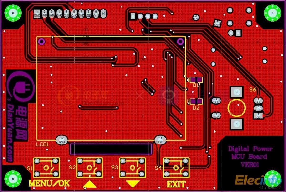 这是一款数码可控的电源设计,通过按键可以控制输出电压的大小。上面是输入,下面是可调的输出,所以输入也被包括在内,但输入的范围是可调的,从十几伏到几十伏都可以。