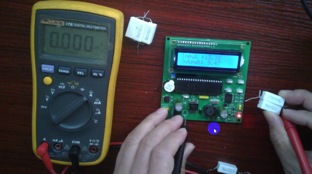 看一下它的载能力,这是一个五瓦实物的电阻,模拟负载,这是电流表,看一下电流是多少,大概是零点九安的样子,但如果是九点五伏,可能会看到阿尔特普特的电压输出。