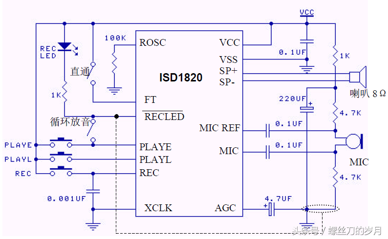 有时候我们看见街头上小贩们不停的播放声音招揽顾客,想不想自己做一个?今天就给大家介绍一款这样的芯片,只需要几个简单的元件就可以组成一个不停播放的喊话器。这款芯片就是ISD1820语音模块。