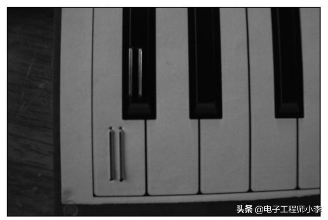 怎么样,是不是很有电钢琴的样子?你说触摸按键在哪里?别着急,让我请出下面这位特别来宾——钉书针。为了整个制作的美观和手感,触摸点的选取费了我很大的心思,试了很多种导体都无法达到满意的效果,直到有一天无意中把钉书针掉在了洞洞板上,我发现它那细长又导电的身体,长度刚刚好可以插进洞洞板,才有了这个有趣的设计。如图9.3所示,按照琴键的位置插好钉书针,并在背面压紧。