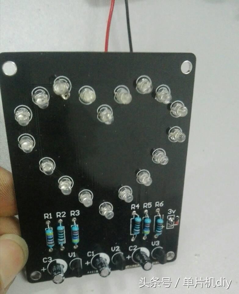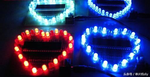 可能有人不理解了为什么原理图中的跑马灯的制作是三个LED灯,而到变成那么多了,其实不管LED灯再多原理都是一样的,那个原理图可以说是单位电路,我们需要多加LED无外乎在原先有LED的地方再多并联几个LED,这样就能做成上图中的心形。