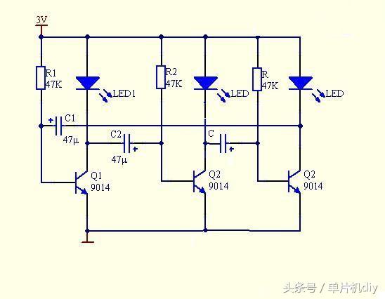 至于能够闪烁的原理呢也不难理解,三极管在电路中充当开关的作用,通上电后最左边的LED由于三极管最先被导通,从而最先被点亮,集电极串联一个电容连接到下一个三极管,当电容充电后把后一个三极管导通,导致后一个LED灯点亮,而由于后一个三极管导通又会引起前一个三极管截止,造成前一个LED熄灭,以次类推循环,这样就形成了这三类LED灯轮流被点亮,通过改变电容的大小还可以改变跑马灯闪烁的时间。