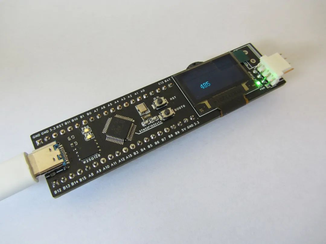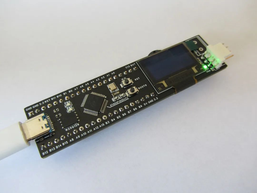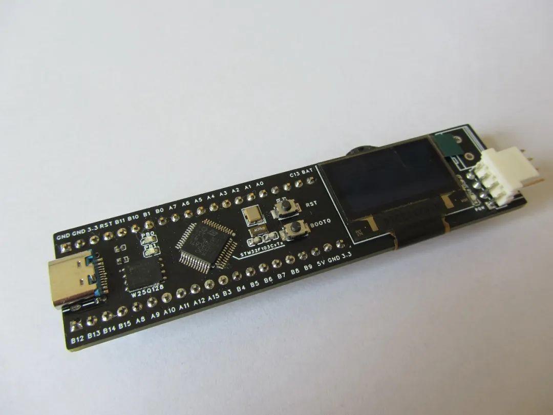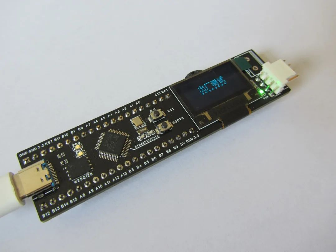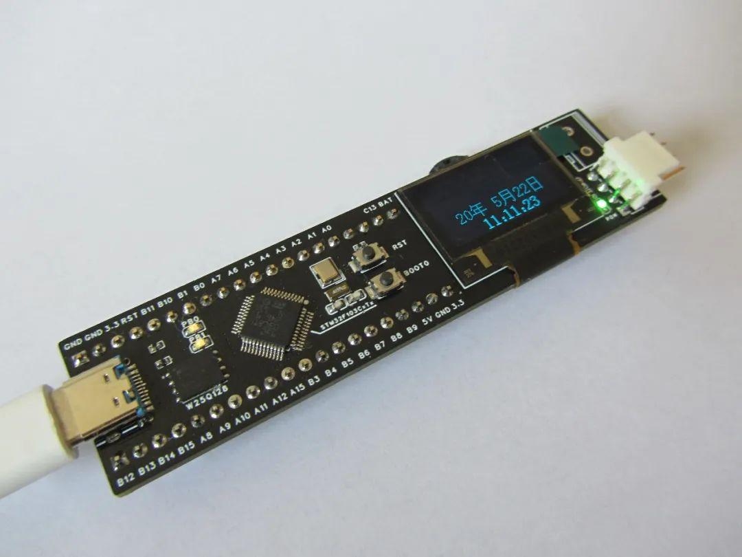 在使用串口烧录时无需选择,一键操作 ;兼容传统STM32C8T6核心板封装与引脚定义;集成0.96OLED显示,方便用户调试 ;预留RTC时钟电池,虽然耗电很快 。注意: 在使用串口及SWD烧录后可能需要手动复位。