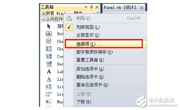 2. 由于默认情况下,通信所需的“Microsoft Communications Control,version 6.0”组件不在工具箱里面,所以我们需要手动添加。单击左侧的工具箱,并在控件栏单击鼠标右键,在弹出的菜单中选中“选择项”,在弹出的对话框中单击“COM组件”并选中“MicrosoftCommunications Control,version 6.0”,单击确定即可完成添加。