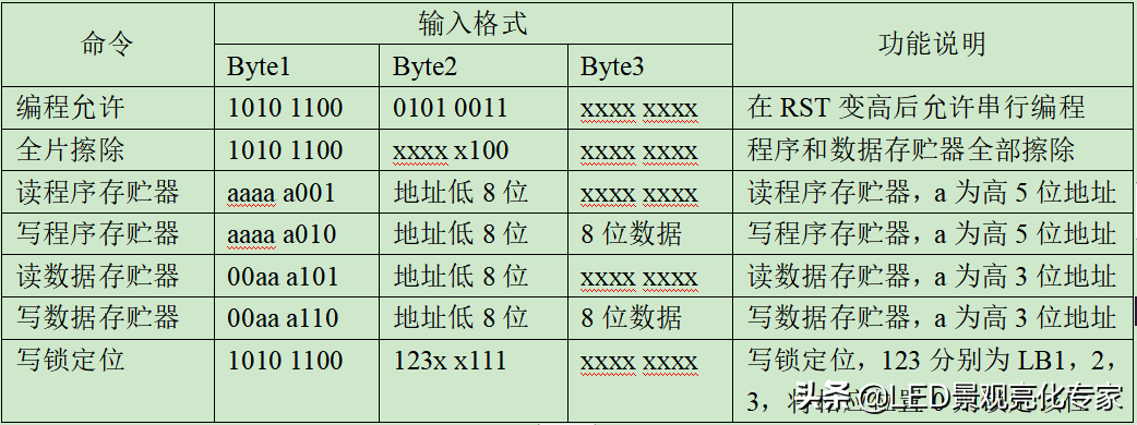 当芯片的RST引脚置高电平时,所有程序和数据存贮器可以通过SPI总线接口[SCK,MOSI(input),MISO(output)]编程。RST变高以后,在编程或擦除操作之前必须首先发送一条编程允许命令。在串行编程模式下,芯片会在字节编程之前自动插入一个擦除周期。因此,除非芯片的代码保护位被编程,编程之前不需要执行全片擦除命令。SPI接口之SCK时钟频率须低于晶振频率的1/40。