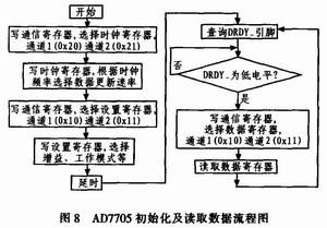 该系统中的AD7705在应用中选择输入通道单极性、初始增益等于1、数据更新速率为500 Hz。AD7705的读写操作严格按照时序进行,图6和图7给出了AD7705的读和写时序图。根据实际确定所有参数以后,对AD7705芯片进行设置,参数设置方法比较独特,在设置参数之前,首先对通信寄存器进行一次写操作,来决定下一个是什么样的寄存器和什么样的操作内容,再进行下一步的参数写入,图8给出了AD7705初始化及读取数据流程图,读者可参考下面的AD7705初始化程序。