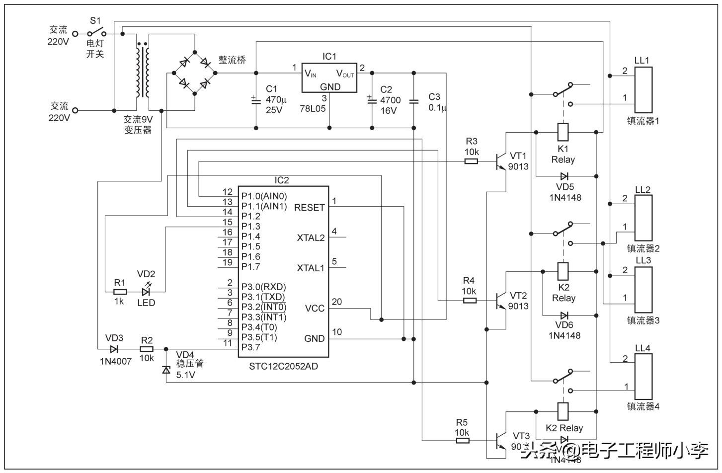 我想实现的功能是开灯后默认点亮2支灯管,要切换灯管数目时只需要关掉开关又马上打开开关,可以按2、3、4、1支方式切换点亮灯管。这样一来就有两个问题需要解决了:一是开关断开后,电源也切断了,电容上的电荷很快被继电器线圈放完电,单片机无法继续工作;二是单片机如何得知开关被关了。图3.2所示是我设计的电路图,带着上面两个问题,我们分析一下电路。