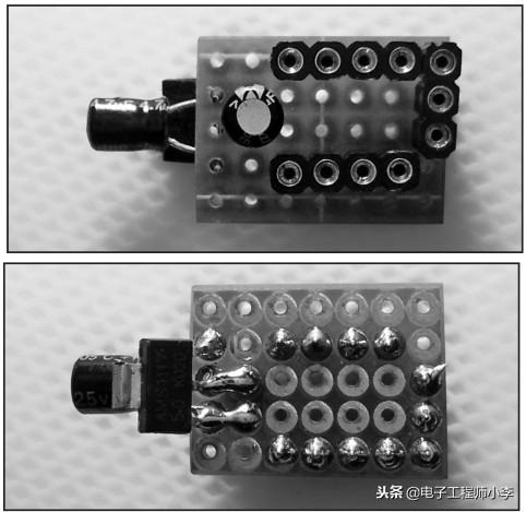 10 用剪下来的元件引脚,焊接控制板到灯泡的电路板上。