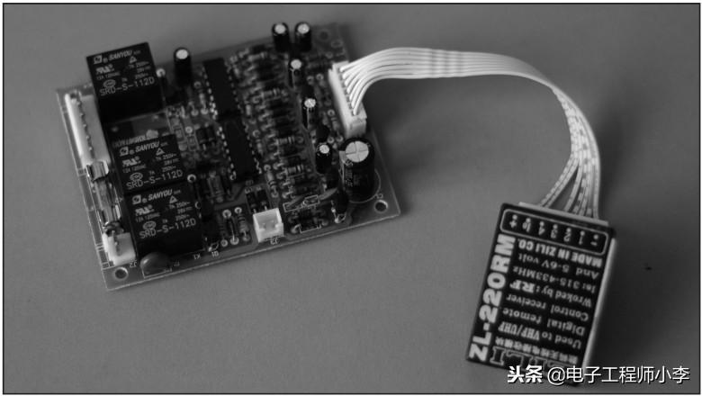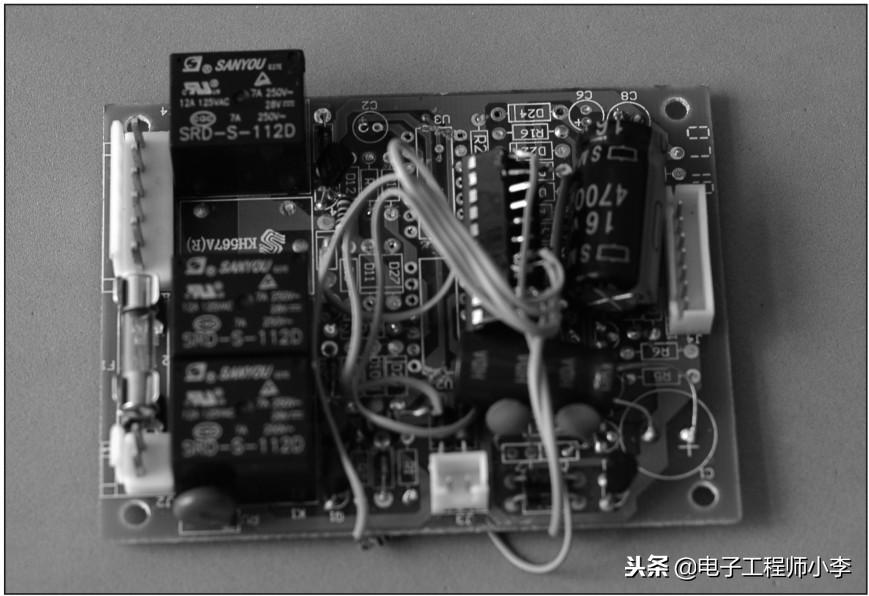 把灯具拆下取出控制器(见图3.1)。可以看到,简单的功能用了好多元件,要是用单片机不是简单好多吗?电路只包括整流电路、无线接收模块和继电器驱动电路。无线接收模块输出的信号经过2片74HC40系列的芯片处理后驱动9013控制继电器闭合。