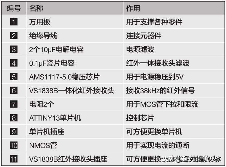 这次制作的主要元器件有:ATtiny13单片机、红外一体接收头和NMOS管,见图4.1。还有一些制作时使用到的辅料,如稳压芯片、万用板、插座、绝缘导线等。具体零件清单如表4.1所示。