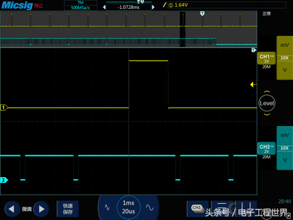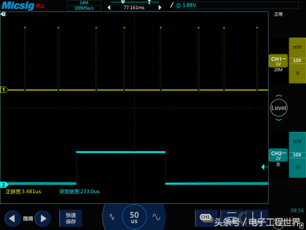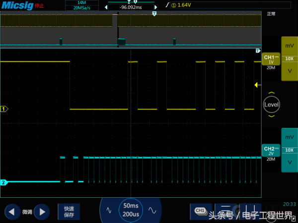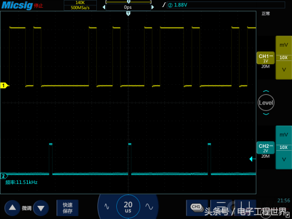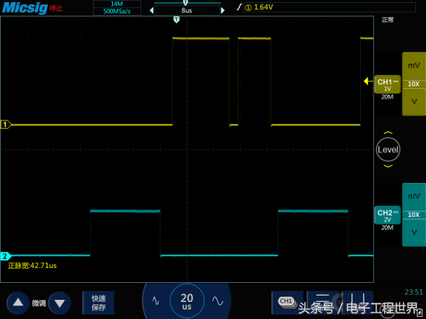 再看一下 uart_puts() 调用的时间开销:黄色线是 UART 输出,青色线高电平是表示在 uart_puts() 函数执行当中。