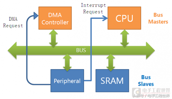 而在 DMA 工作时,DMA 控制器收到来自硬件设备的 DMA 请求,将直接去 SRAM 某个地址读取一个长度单位的数据,然后写到设备的某个寄存器地址。这里 DMA 控制器和 CPU 都要访问总线,是由一个仲裁器在决定谁可以用。DMA 控制器访问时,CPU 的访问会被延迟一点时间,但对程序执行的影响很小。