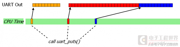 要照顾执行效率的时候一定不能这么做,特别是在多任务环境下,因为这种循环重复查询标志位的做法让其它任务也只能等待,没有利用CPU处理能力。于是我们需要一种“后台”输出的方法,让当前任务将要从串口输出的字符串提交到系统之后,程序往下执行,不用等待字符串从串口发送完;或者是当前任务等待字符串发送完,但是其它任务可以执行。