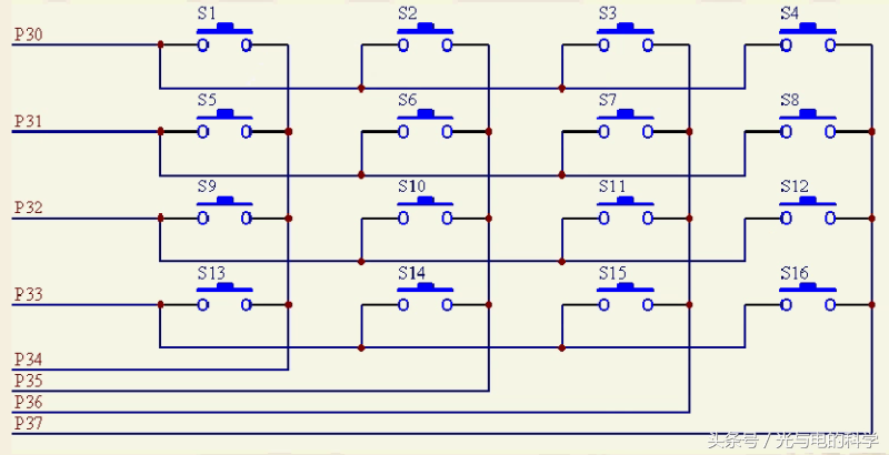 在键盘中按键数量较多时,为了减少I/O口的占用,通常将按键排列成矩阵形式。在矩阵式键盘中,每条水平线和垂直线在交叉处不直接连通,而是通过一个按键加以连接。这样,一个端口(如P1口)就可以构成4*4=16个按键,比之直接将端口线用于键盘多出了一倍,而且线数越多,区别越明显,比如再多加一条线就可以构成20键的键盘,而直接用端口线则只能多出一键(9键)。由此可见,在需要的键数比较多时,采用矩阵法来做键盘是合理的。