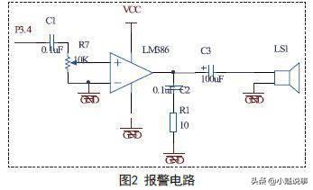 本系统报警电路使用L M 3 8 6作为报警器的功率放大器。LM386是一种音频集成功放,具有自身功耗低、电压增益可调整、电源电压范围大、外接元件少和总谐波失真小等优点,广泛应用于录音机和收音机之中。