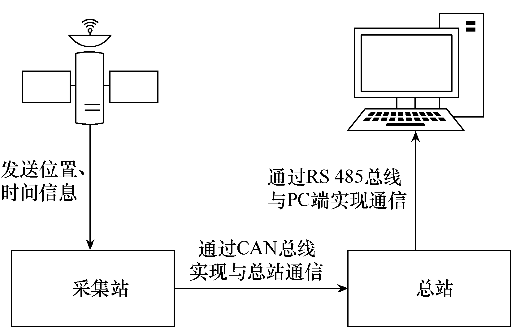 本文所设计系统的关键在于位置信息的获取及信息的传递,根据系统工作的实际情况,需要通过两部分实现。一部分安装在各个故障检测处,主要负责接收GPS信号及监测是否发生故障,命名为采集站;另一部分为监测端,主要是接收来自采集站的故障位置信息并实现与PC端通信,便于工作人员了解故障发生位置,命名为总站。