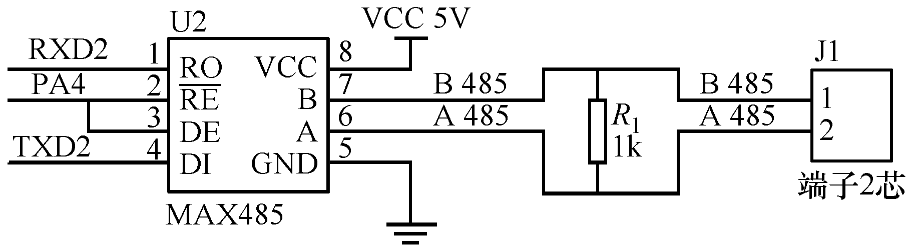 MAX485芯片主要负责总站与上位机的通信工作,将接收到来自采集站与总站之间使用CAN总线传输的信息,通过RS 485接口实现与PC端的实时通信。MAX485芯片与单片机连接方式如图7所示。虽然CAN总线具有较好的传输性能,但是仍无法与上位机之间实现直接通信,需要借助Modbus协议与上位机进行通信。